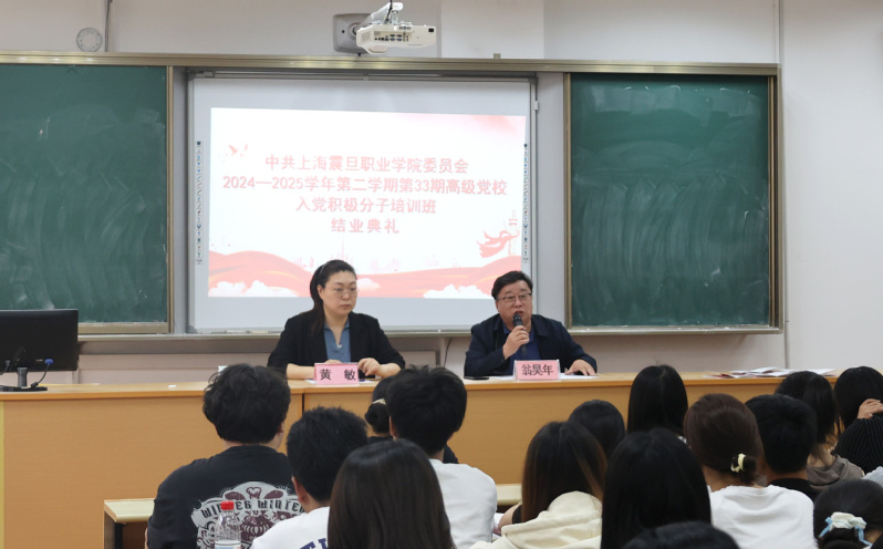 2025年4月16日下午,上海震旦職業(yè)學(xué)院第三十三期高級(jí)黨校入黨積極分子培訓(xùn)班結(jié)業(yè)典禮在教學(xué)樓1-209室舉行。黨委副書記黃敏、黨委組織部副部長(主持工作)翁昊年、各二級(jí)學(xué)院黨總支書記以及第三十三期高級(jí)黨校全體學(xué)員參加了典禮。典禮由翁昊年主持。