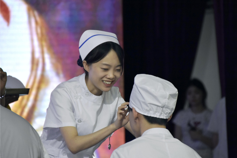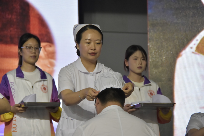 授帽儀式環(huán)節(jié),全體2023級護(hù)理學(xué)生面帶微笑,邁著整齊而堅毅的步伐走上舞臺,在護(hù)理專業(yè)老師殷切目光的注視下,戴上象征著圣潔的天使的潔白護(hù)士帽,并在2023級護(hù)理2班陳莎同學(xué)的帶領(lǐng)下進(jìn)行宣誓。