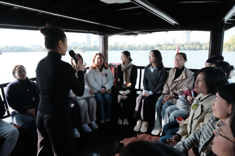當(dāng)日,黨員同志們乘坐Y701紅色專列奔赴嘉興,在會景園碼頭登船遠眺。在船上,教師黨支部書記高敏老師以“南湖的回響”為題,帶來了一場簡短而深刻的微黨課。她結(jié)合黨史故事與新時代使命,生動闡釋了“開天辟地、敢為人先的首創(chuàng)精神,堅定理想、百折不撓的奮斗精神,立黨為公、忠誠為民的奉獻精神”的核心內(nèi)涵。全體黨員圍坐船頭,沉浸式參與“水上課堂”,接受了一次深刻的思想淬煉。