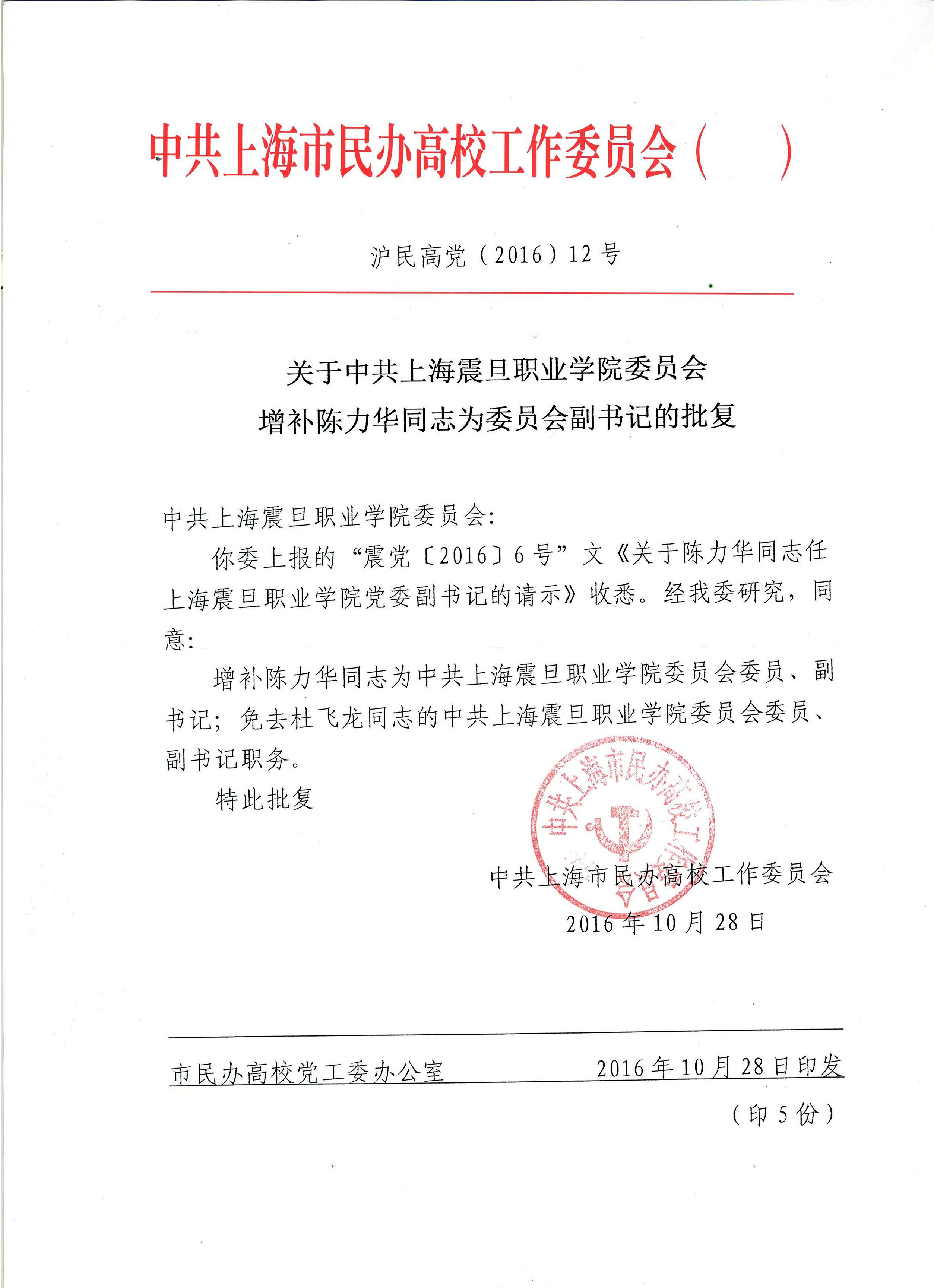 關(guān)于中共上海震旦職業(yè)學(xué)院委員會(huì)增補(bǔ)陳力華同志為委員會(huì)副書記的批復(fù)